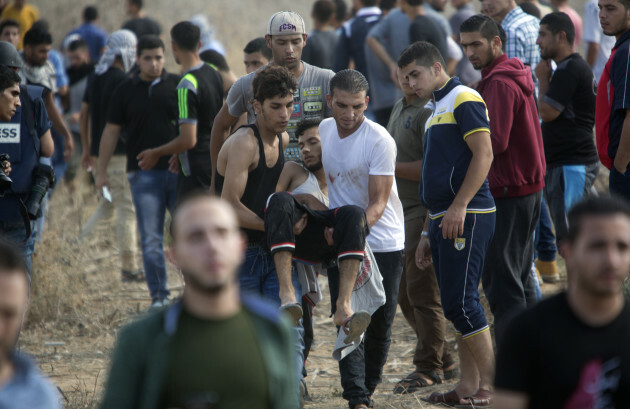 Palestinians carry a wounded protester who was shot by Israeli troops, during clashes near the Israeli border fence in northeast Gaza